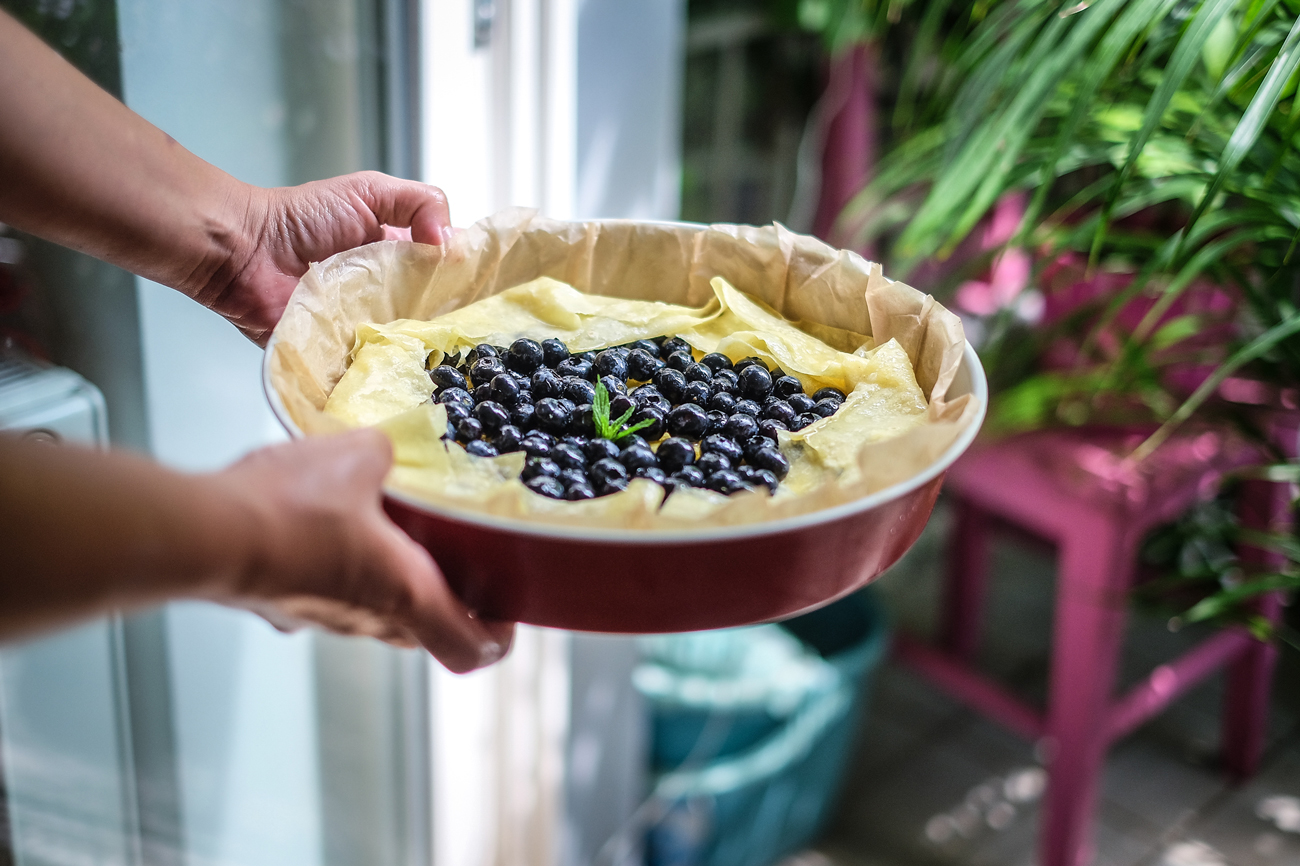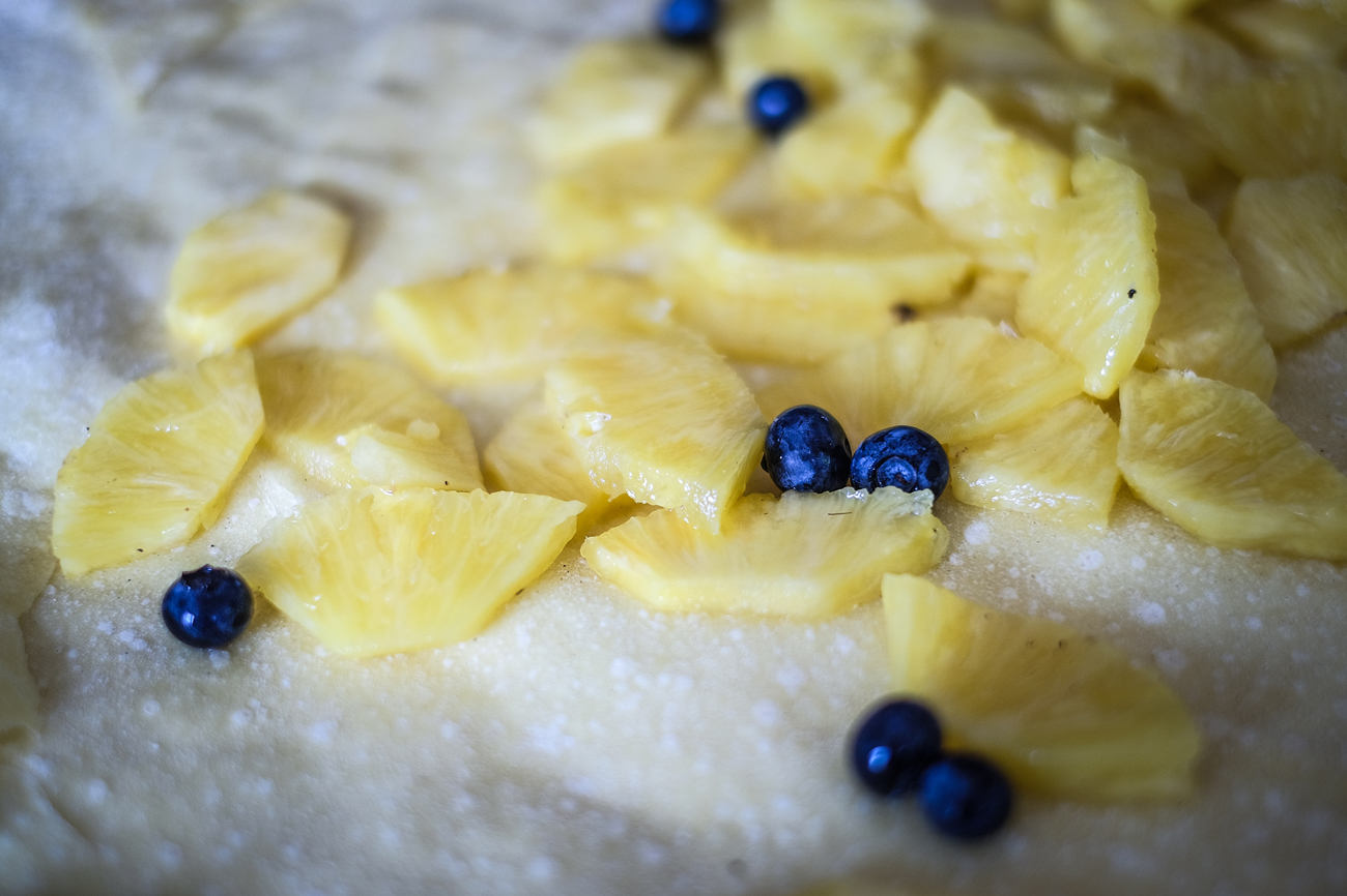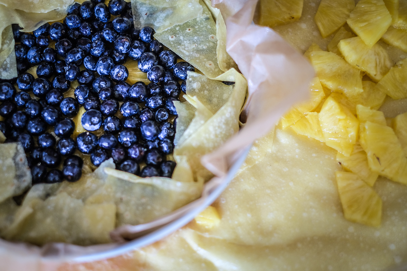 4. Kad ih dobro natopite, stavite ih u kalup kojega inače koristite za pite ili pečenje prhkoga tijesta. Naslažite ananas ravnomjerno po dnu kalupa, rasporedite po njemu svježe borovnice, naribajte po svemu malo tonke i prošarajte agavinim sirupom/medom ili kakvim drugim prirodnim zaslađivačem. Poškropite s par kapi limunovog soka, rastopljenog maslaca i zarolajte ostatak lisnatoga preko ruba, e da bi kolač dobio – okvir olitiga obrub! Isti premažite – rastopljenim maslacem!