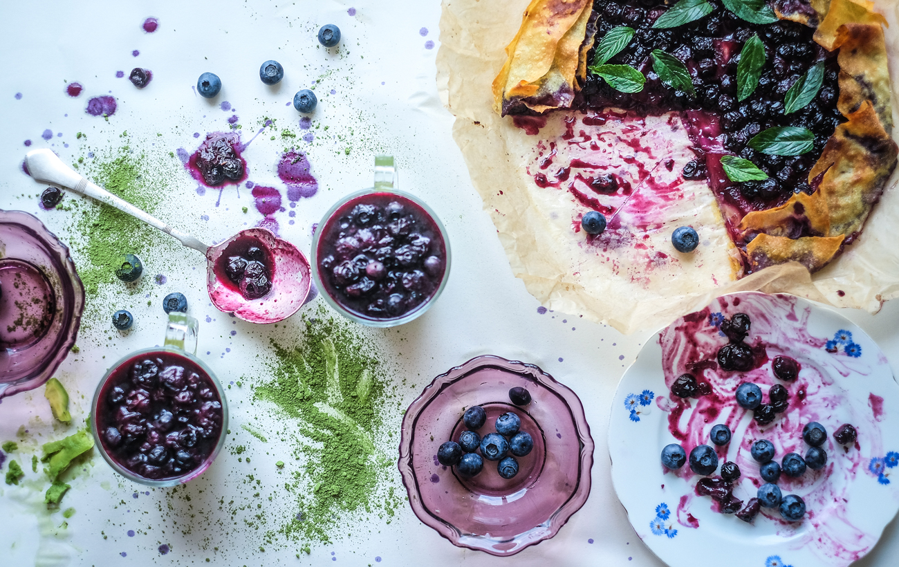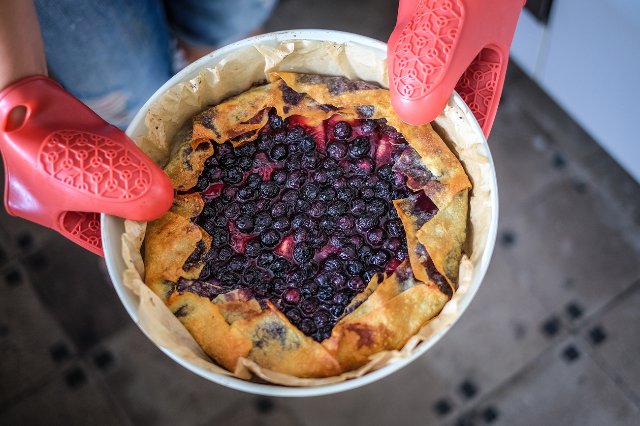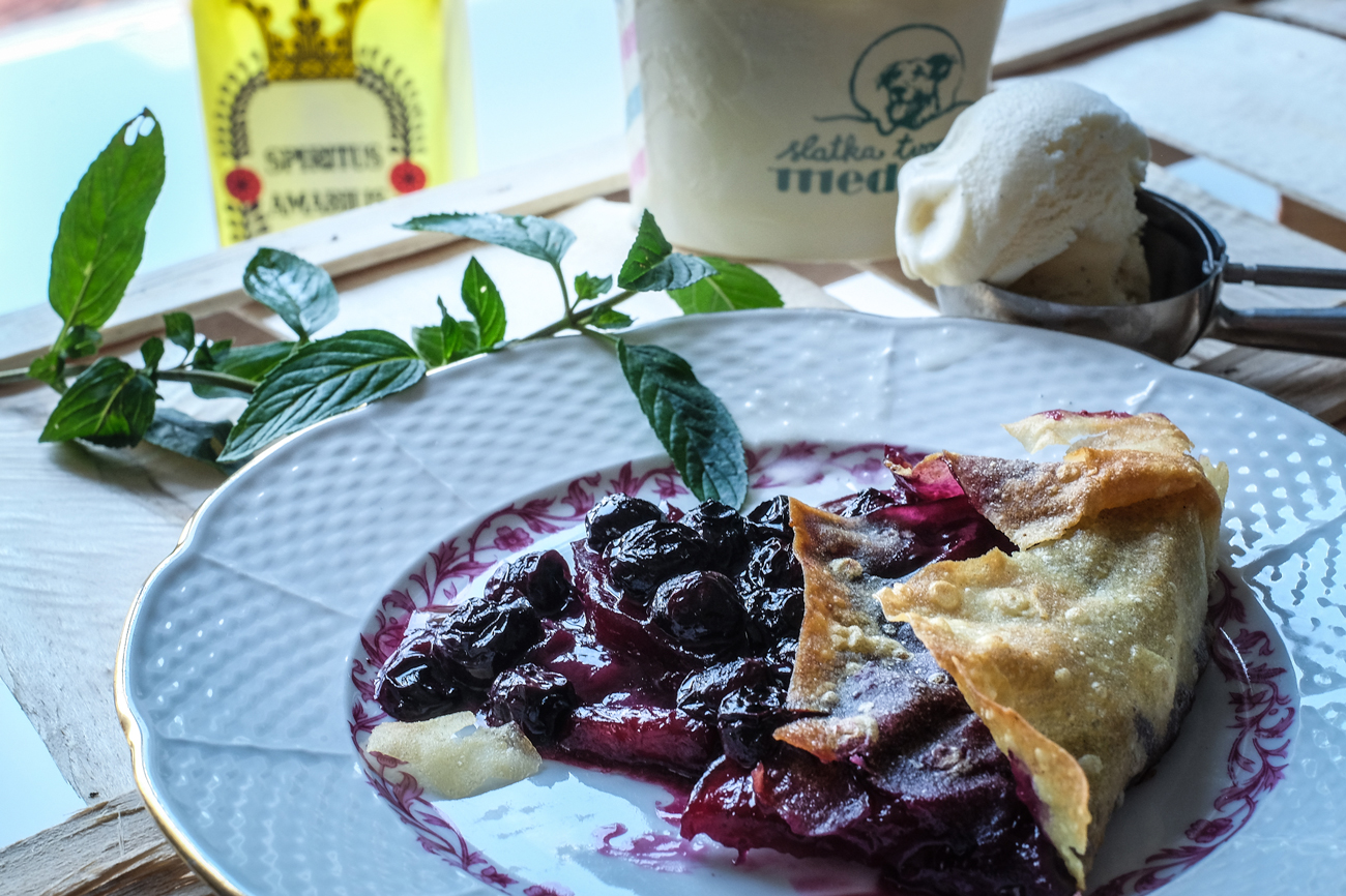 4. Kad ih dobro natopite, stavite ih u kalup kojega inače koristite za pite ili pečenje prhkoga tijesta. Naslažite ananas ravnomjerno po dnu kalupa, rasporedite po njemu svježe borovnice, naribajte po svemu malo tonke i prošarajte agavinim sirupom/medom ili kakvim drugim prirodnim zaslađivačem. Poškropite s par kapi limunovog soka, rastopljenog maslaca i zarolajte ostatak lisnatoga preko ruba, e da bi kolač dobio – okvir olitiga obrub! Isti premažite – rastopljenim maslacem!